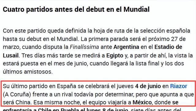 进入6月份,西班牙还将安排两场关键的热身比赛。6月8日的对手已确定为来自南美的智利,比赛地点选在墨西哥普埃布拉;而6月4日的比赛则尚未最终确定对手,但有消息称很可能是中国男足。届时,西班牙全队将在此次热身赛结束后连夜飞赴墨西哥,以最佳状态迎接世界杯。而选择与中国男足交手,其中一个重要考虑是视中国队为小组同伴沙特的“模仿敌人”,以便更好地分析和准备。
